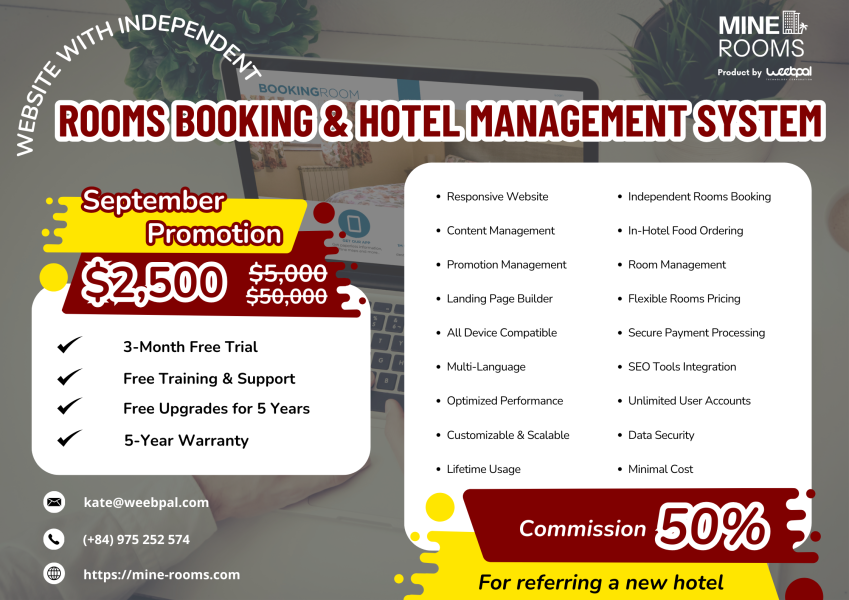Looking for the ultimate hotel management solution? Look no further than Mine Rooms. Our feature-packed Website with Independent Rooms Booking & Hotel Management System is designed to cater to hotels of every size. This September, unlock incredible savings with our exclusive promotion — valued at $50,000, now yours for just $2,500 (50% off the regular price of $5,000). Plus, enjoy a 3-month free trial and see firsthand why Mine Rooms is the top choice for forward-thinking hotels. Discover unmatched efficiency, innovation, and value with us today!