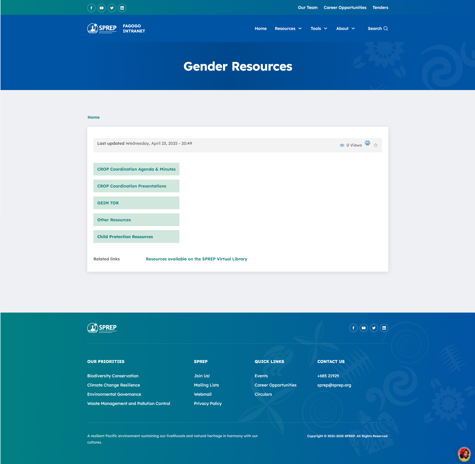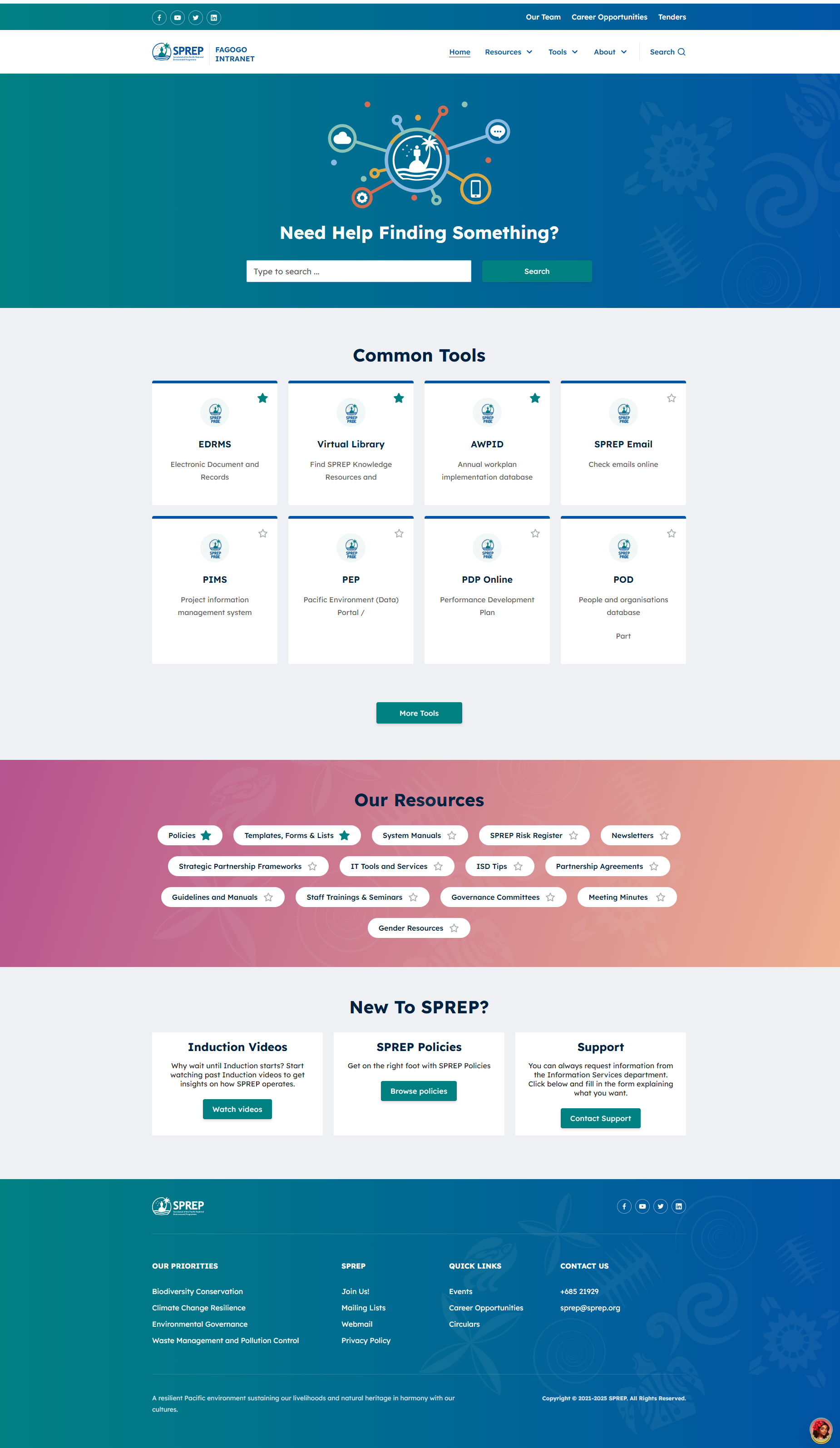 Fagogo is the official intranet platform of SPREP, serving as the central digital workspace for staff across the Secretariat and its regional offices. It provides streamlined access to internal documents, organizational policies, collaboration tools, training and induction resources, and personalized dashboards tailored to team needs. The platform supports efficient workflows, secure information management, and improved collaboration — reinforcing SPREP’s capacity to coordinate environmental programmes, policy delivery, and member support across the Pacific region.