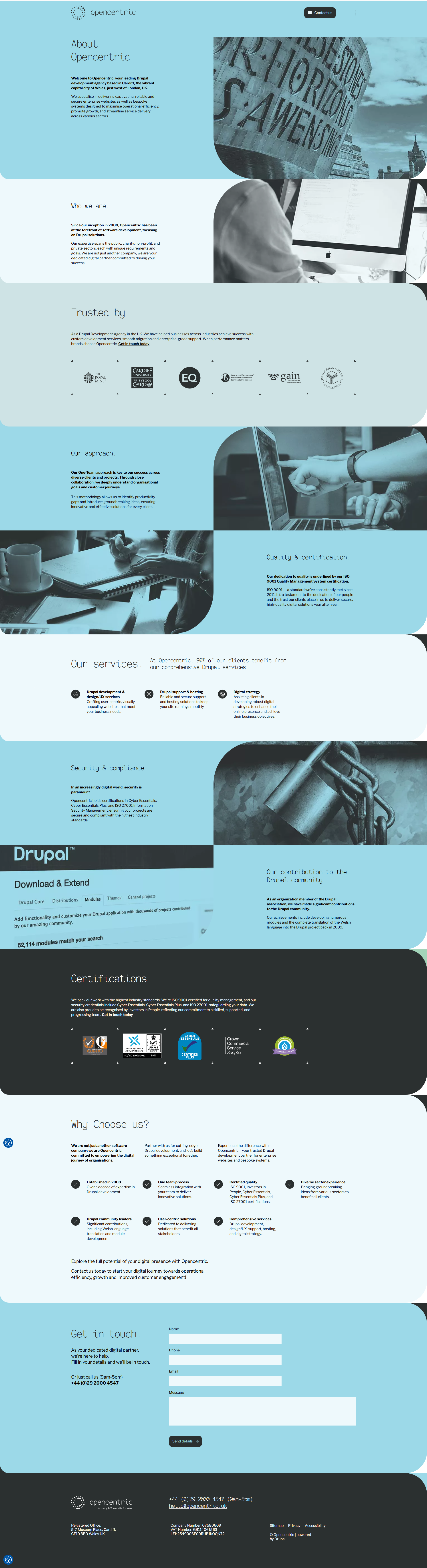 Opencentric Ltd. is a UK-based Drupal development agency specialising in building robust, secure, and user-centric digital solutions for enterprises, public sector organisations, charities, and non-profits. Founded in 2008 and headquartered in Cardiff, Opencentric offers a full suite of services — from custom Drupal development, site design and UX, content migration, to hosting, maintenance, and digital strategy. With certifications such as ISO 9001 (quality management) and ISO 27001 (information security), along with security credentials like Cyber Essentials, the company ensures high standards for both performance and security. Their “One Team” approach means close collaboration with clients to deeply understand business needs, enabling tailored solutions that are scalable and maintainable. Trusted by a range of high-profile clients across sectors, Opencentric empowers organisations to leverage open-source technology for long-term digital success.