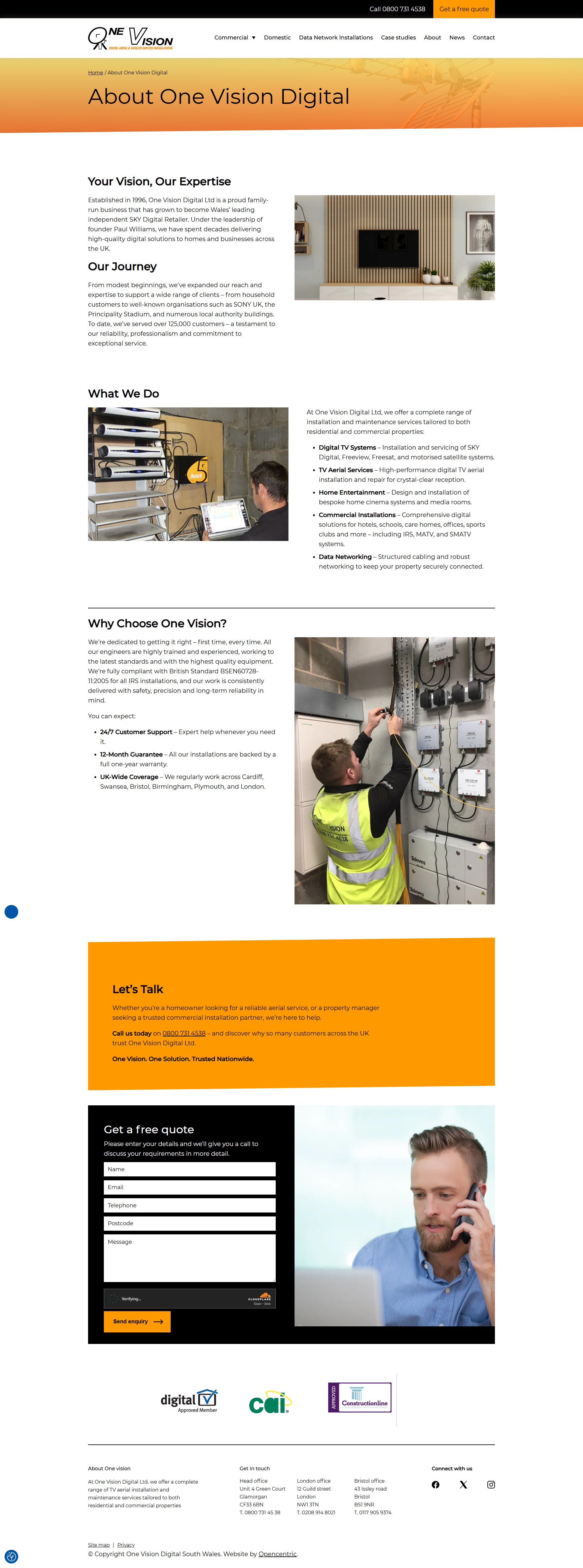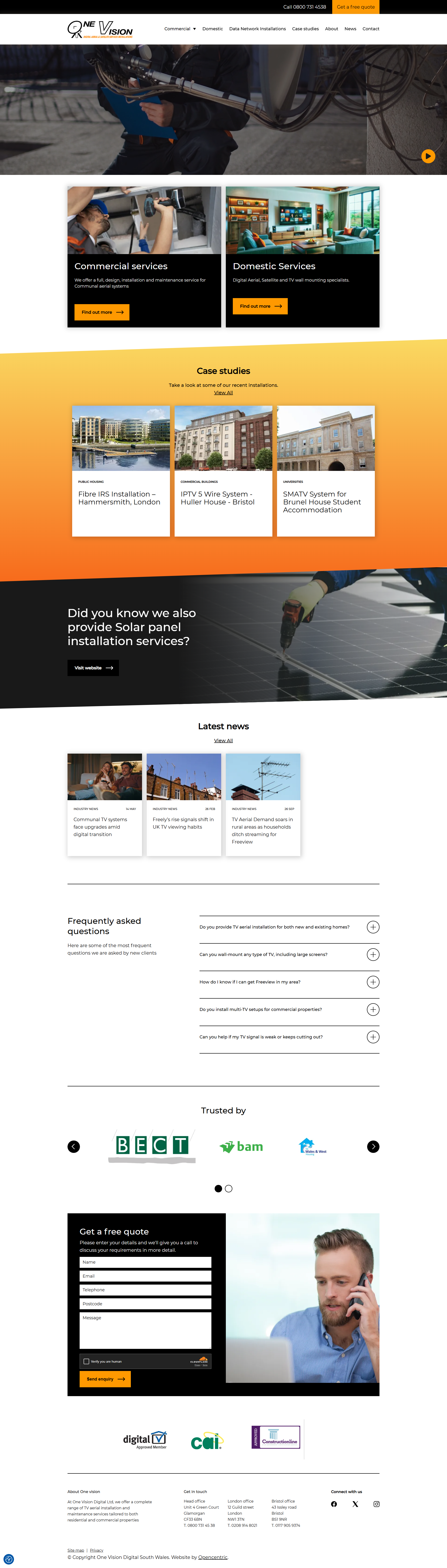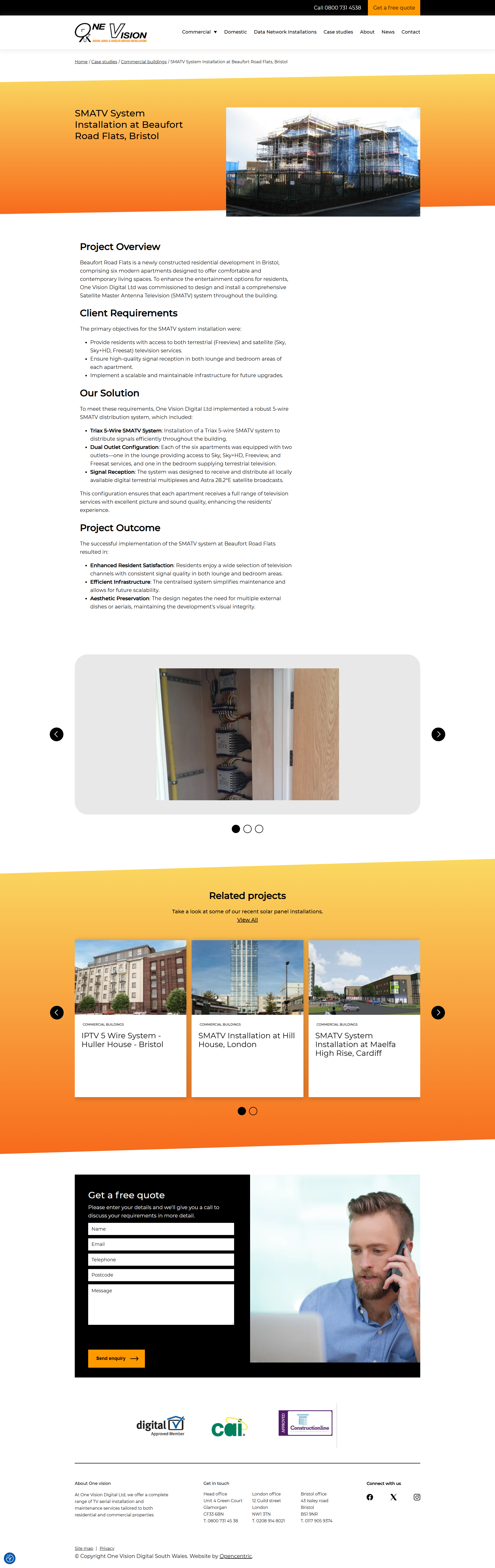 The project builds a digital presence for a company specialising in installation and maintenance of TV aerials, satellite dishes, communal and multi‑dwelling reception systems (MATV/SMATV/IRS), data network installations, and TV wall‑mounting services for both domestic and commercial clients. The platform clearly presents the full service catalogue (from individual home installations to large-scale communal systems for apartment blocks or student accommodation), showcases detailed case studies, and provides easy contact/quote request mechanisms. Designed for both individual homeowners and large property developers or managers, the site supports clear communication of services, builds trust through past project history, and streamlines customer enquiries and bookings. Released 2024 Screenshots