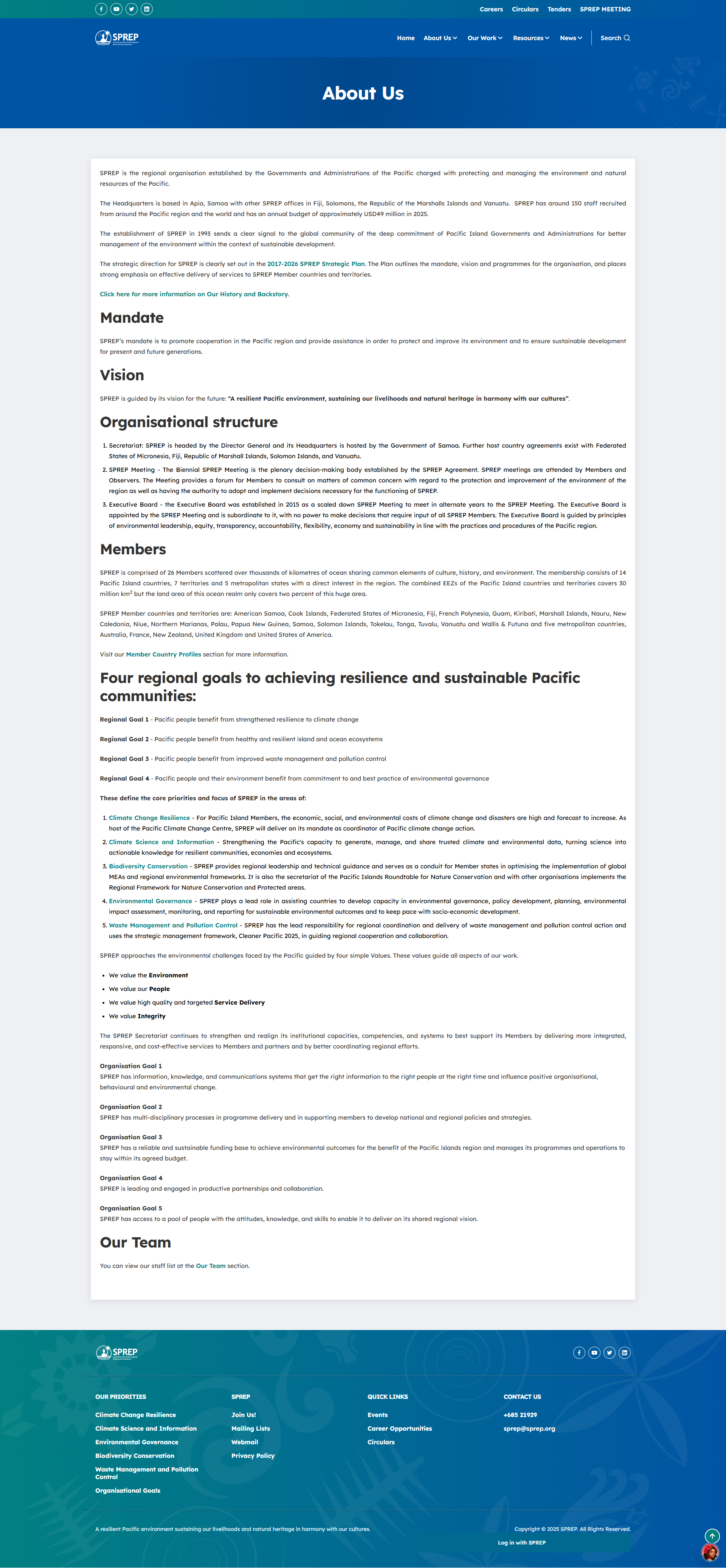 The Secretariat of the Pacific Regional Environment Programme (SPREP) is the leading intergovernmental agency dedicated to protecting and sustaining the Pacific environment. Serving 26 member countries and territories, SPREP plays a central role in coordinating regional efforts on waste management, pollution control, climate resilience, biodiversity conservation, and environmental governance. Through scientific research, capacity building, policy development, and technical partnerships, SPREP empowers Pacific communities to address pressing environmental challenges—from marine debris and hazardous waste to ecosystem degradation and climate-related risks. The organisation's initiatives support governments, local communities, and environmental stakeholders in ensuring a healthy, resilient, and sustainable Pacific region for future generations.